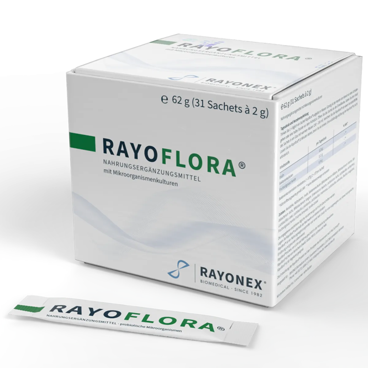 Rayoflora® nu conține aditivi, lactoză, gluten, proteine animale și drojdie și, prin urmare, este potrivită pentru vegetarieni și vegani. Conceptul de supliment alimentar al Rayonex Biomedical GmbH se bazează pe un sistem medicinal natural dovedit, orientat spre cauze și patentat.
